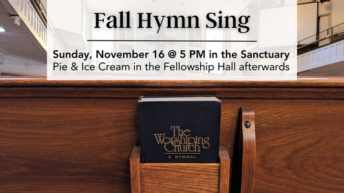 Join us on Sunday, November 16, for a Hymn Sing at 5 PM in the sanctuary with a dessert fellowship following at 6 PM in the Fellowship Hall. Our worship will include more than just hymns. We will also enjoy a wind ensemble as well as a choir made up of members and friends of FirstMC to give thanks to our good God. Mark your calendars - you won’t want to miss it!